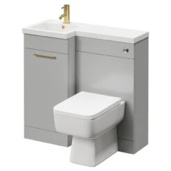 Embracing the prevailing fondness for grey-toned interiors, we proudly introduce the Napoli Combination Gloss Grey Pearl 900mm Vanity Unit Toilet Suite with a Left Hand L Shaped 1 Tap Hole Basin and Single Door with Brushed Brass Handle.