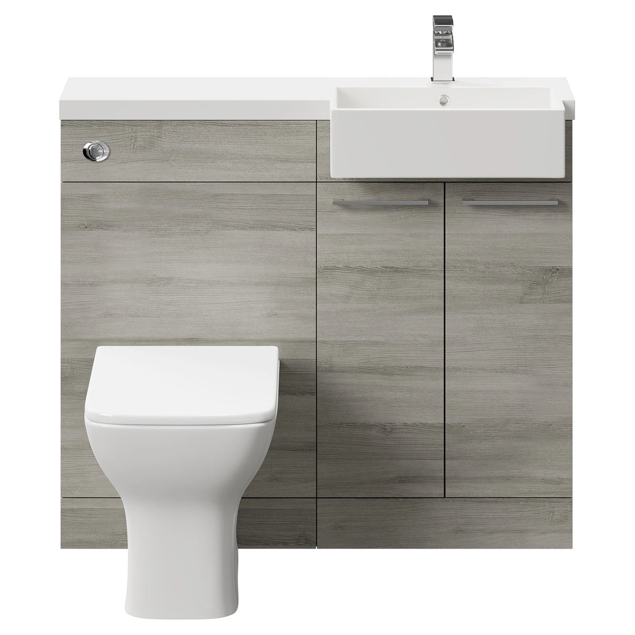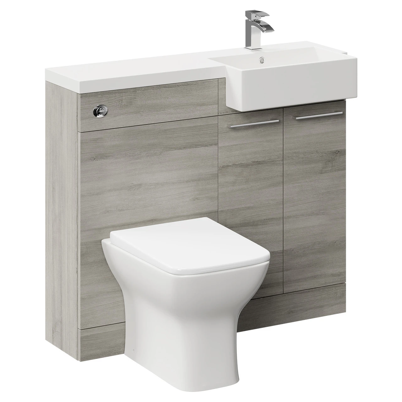 Simplistic and stylish, the Napoli Combination Molina Ash 1000mm Vanity Unit Toilet Suite with Right Hand Square Semi Recessed 1 Tap Hole Basin and 2 Doors with Polished Chrome Handles is the ideal all-in-one solution for your bathroom. Featuring a gorgeous angular design, this vanity toilet suite boasts ample storage space inside, a basin on top, and a toilet to the side of the vanity.